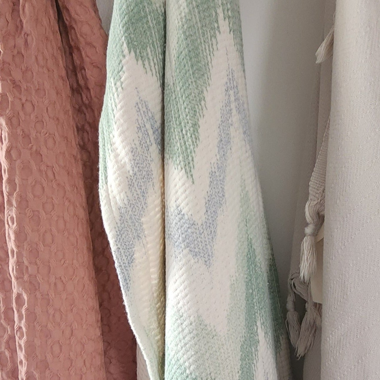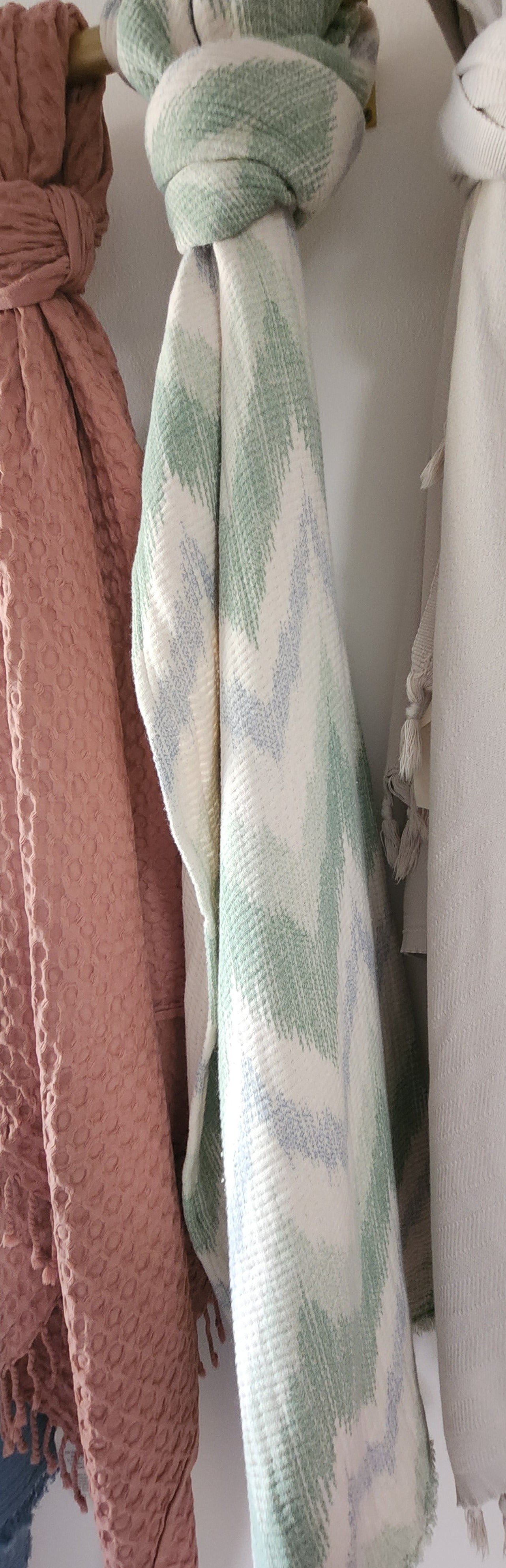 This cozy gauze throw blanket with a blue + green chevron is perfect for over the couch or at the end of a bed.