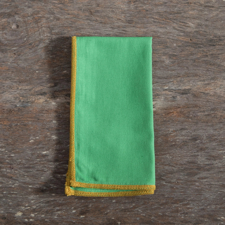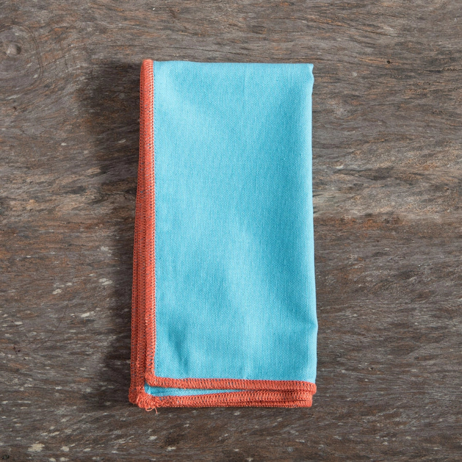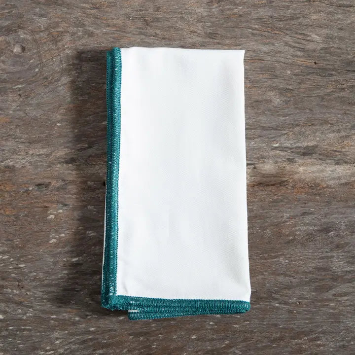 The easiest way to add a little something to your table is with these cotton plain colored napkins with contrast color piping. The Green has a classic gold piping, while the light blue has a tropical coral color, and the white has our all-time favorite, a cool emerald/teal perfect for any style. These are so fun with our woven napkin rings!