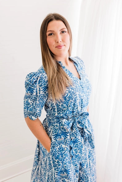 This beauty of dress is reminiscent of classic Italian blue florals and features scalloped sleeves with a matching scalloped belt.