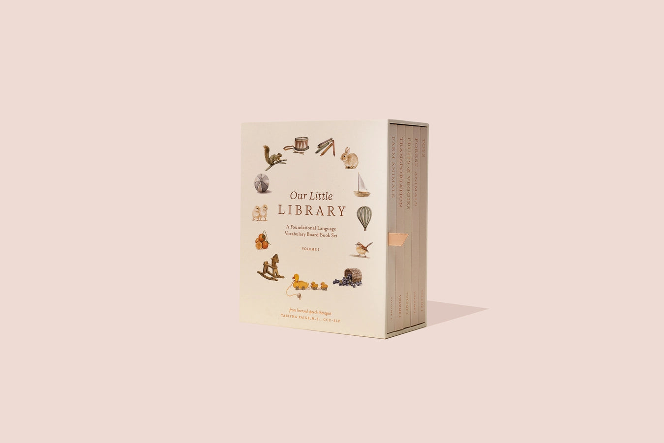 Designed by a professional watercolor artist and licensed speech therapist, Our Little Library features five board books that feature charming images and foundational vocabulary that will help you build your child's vocabulary. The durable materials and small book size also make them perfect for your baby's little hands.
