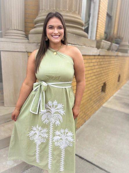 A beautiful woven cotton, hand embroidered palm tree dress featuring a one shoulder neckline. The accentuated waist tie replicates classic southern charm entwined with a splash of Palm Beach.