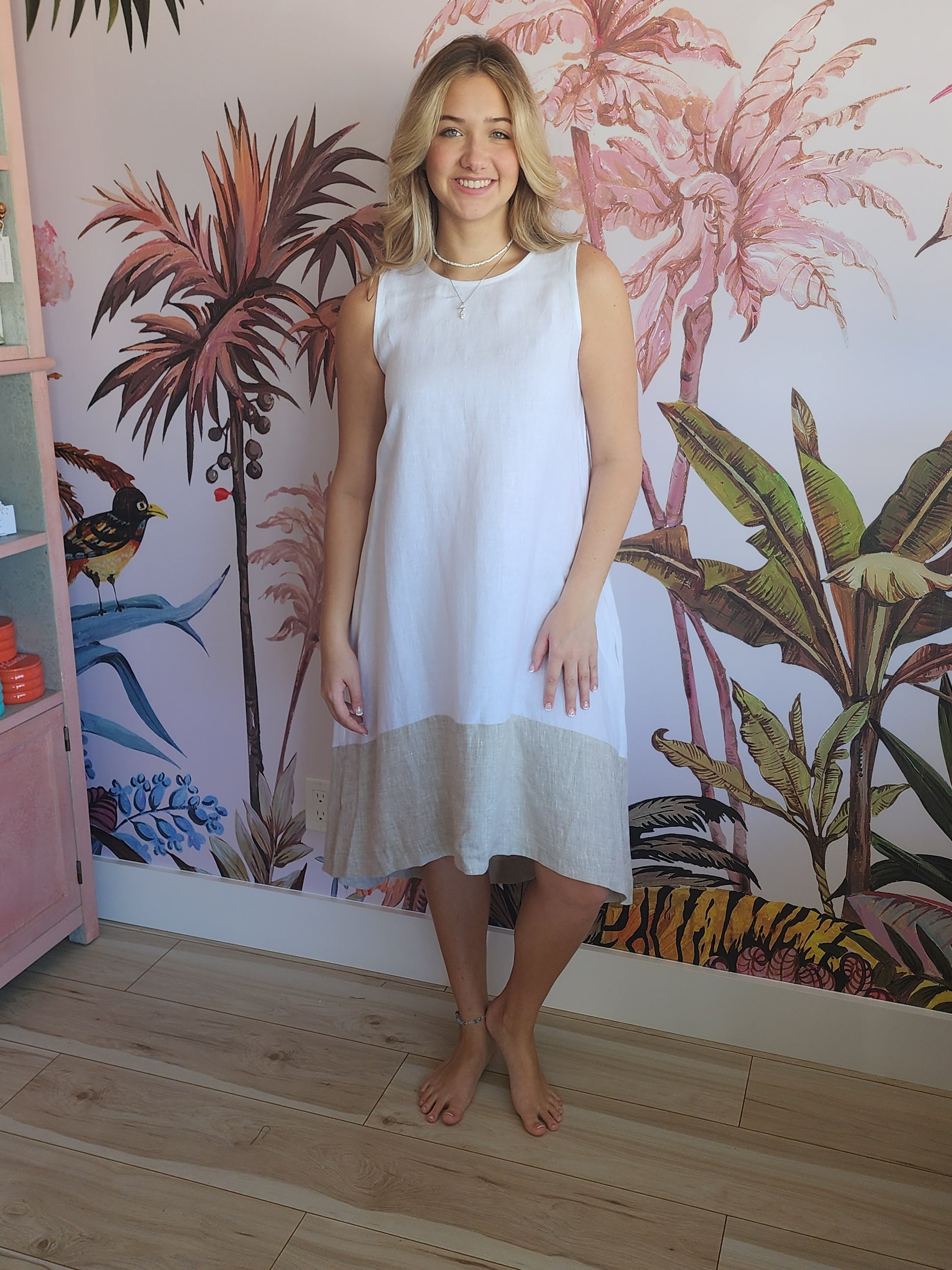 Sleeveless linen dress with a classic high low hem with a natural color block bottom.