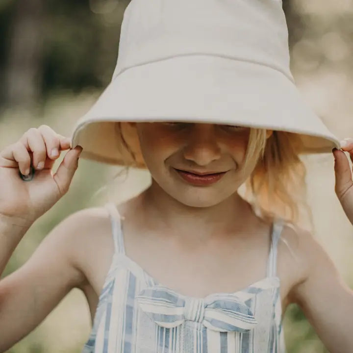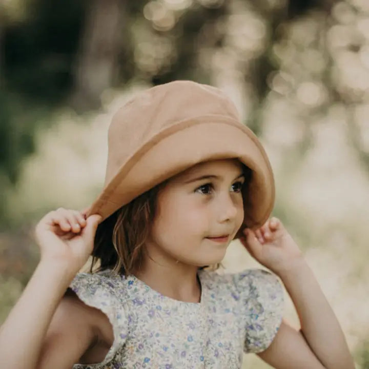 The cutest little, short brim bucket hat for your favorite kiddo in cream or toffee.
