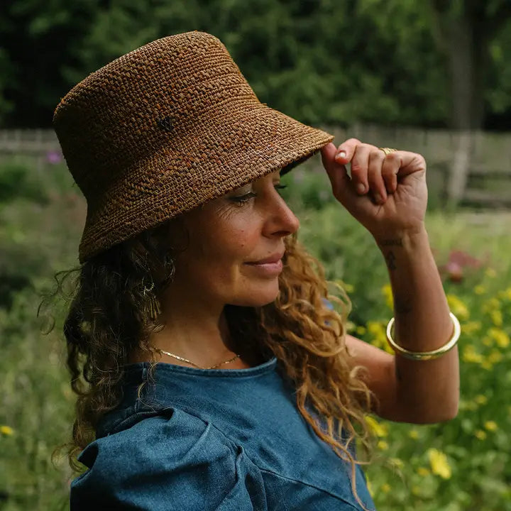 The WV Mace Raffia Bucket hat is woven crochet details can be seen throughout the brim and crown that is crafted with 100% raffia straw. It’s designed slightly shorter at the back to sit perfectly on the head.